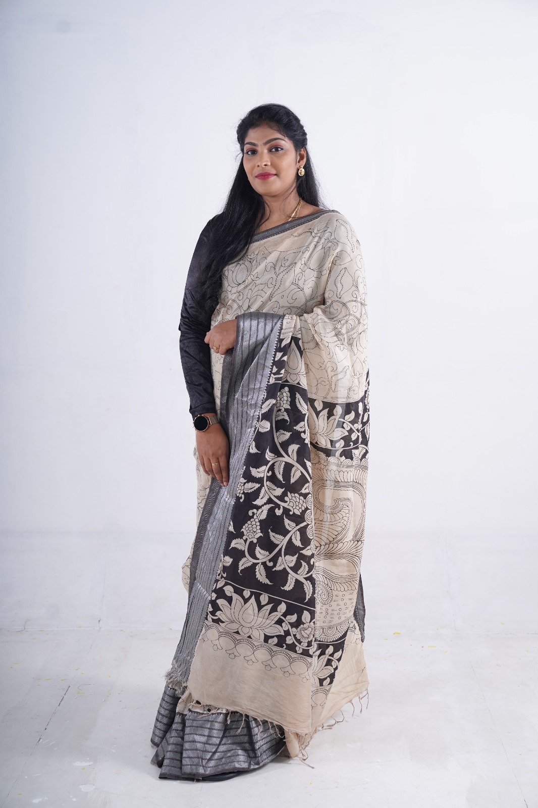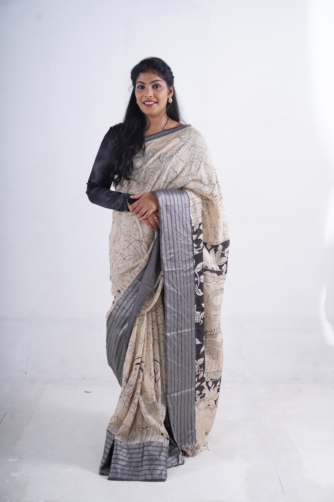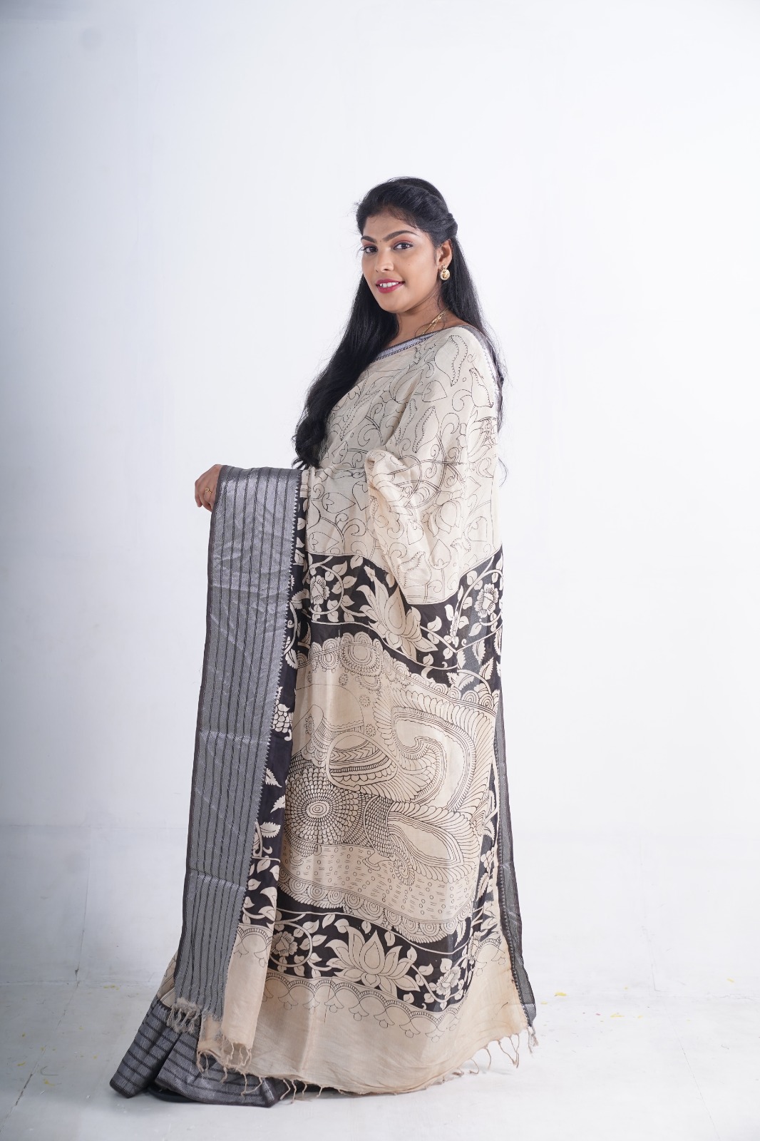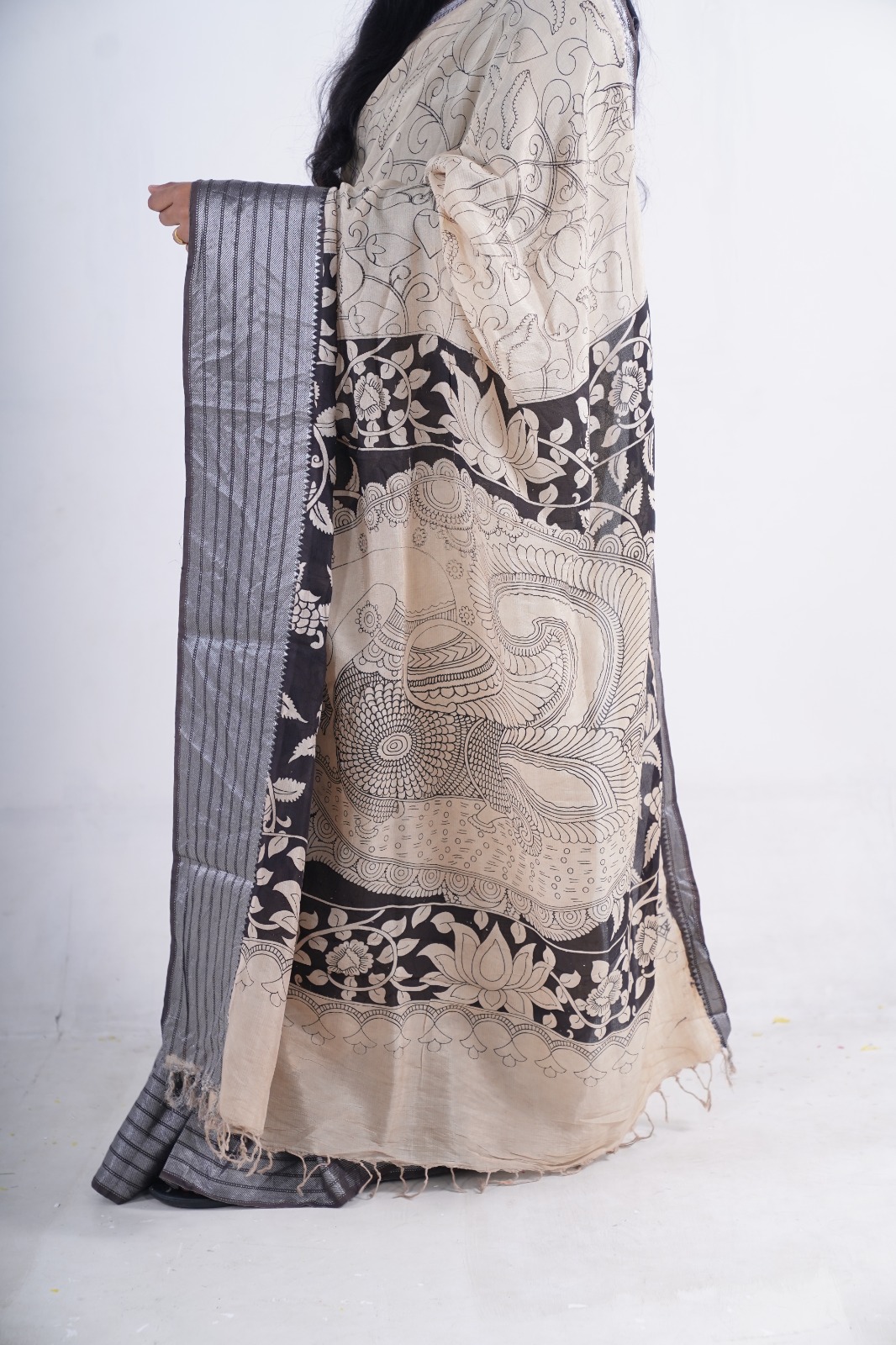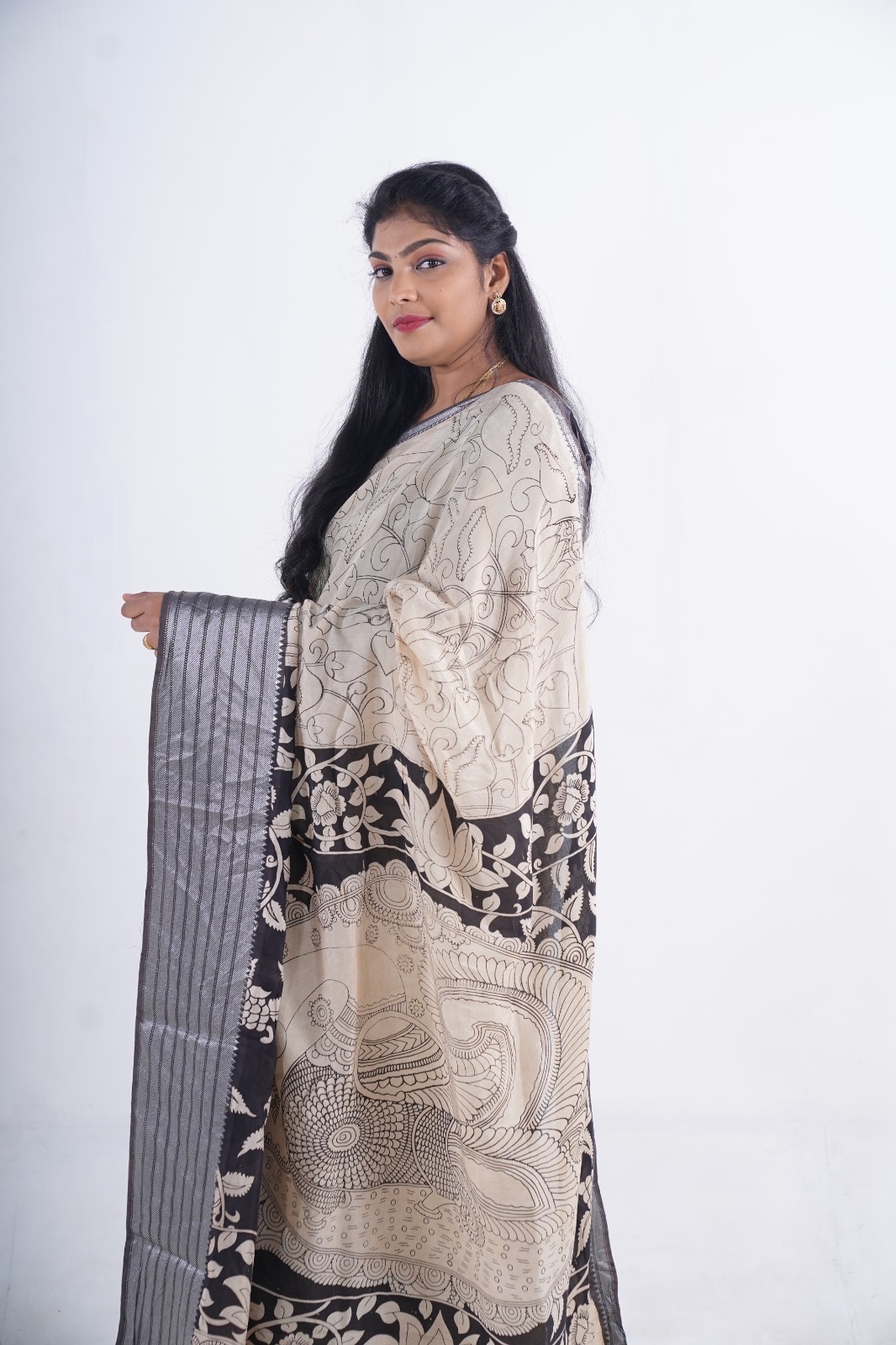 The contrasting black pallu and border are beautifully adorned with detailed Kalamkari floral and peacock patterns, creating a rich visual appeal. The subtle cream base enhances the intricate artwork, while the silver zari border adds a refined shimmer, making it ideal for both festive occasions and elegant gatherings.