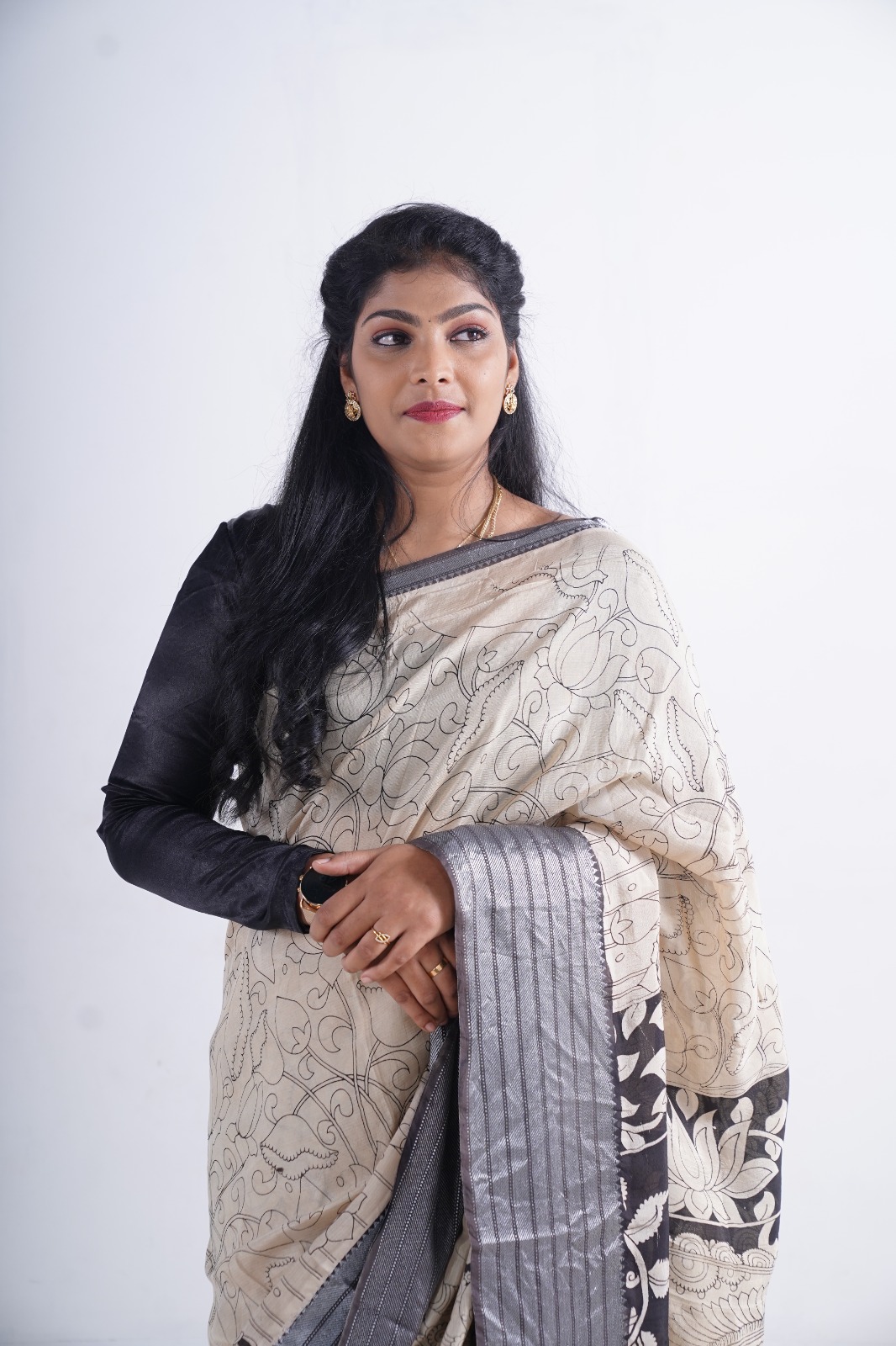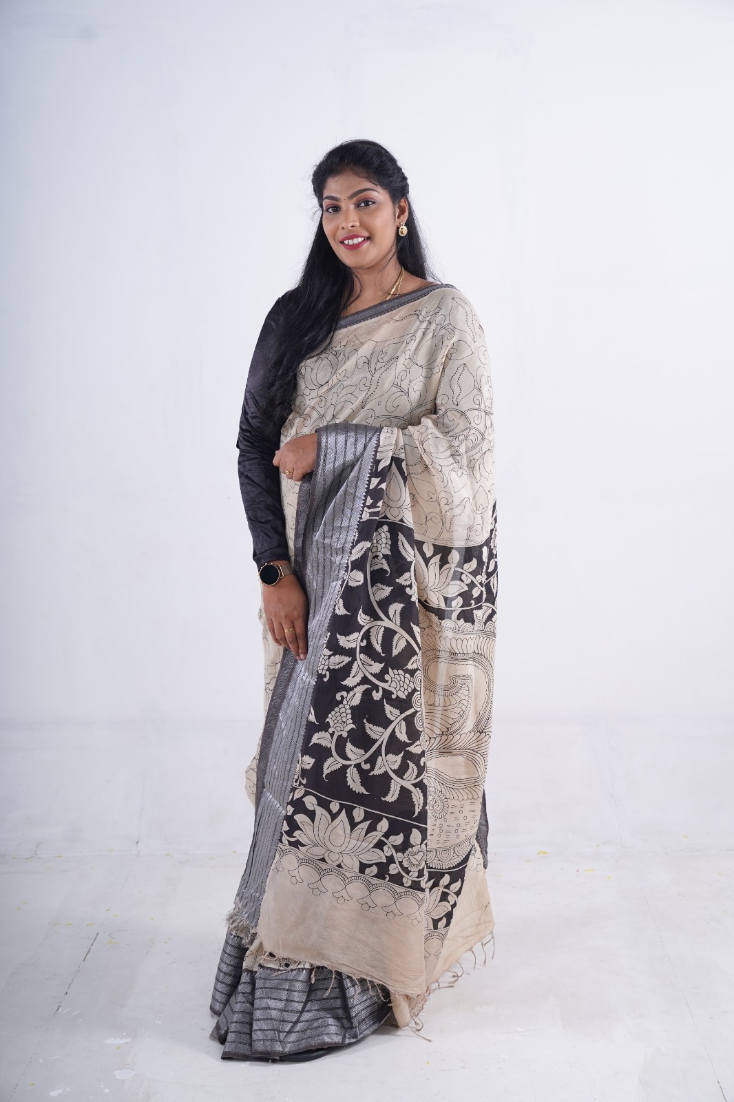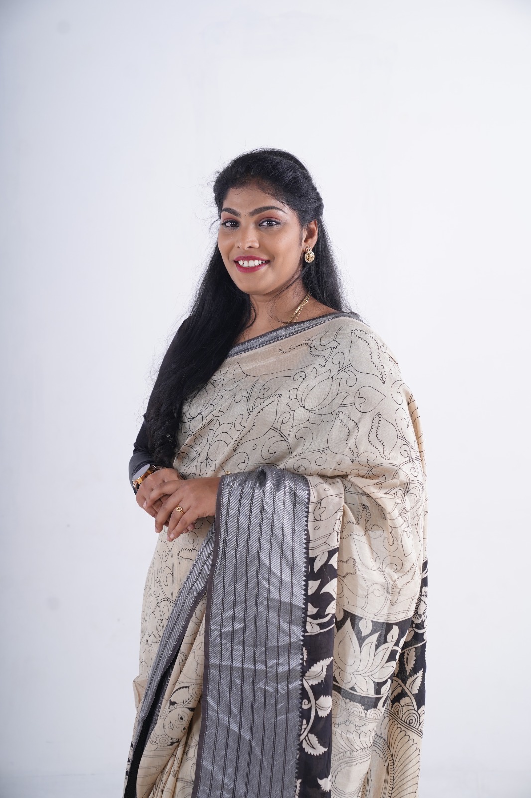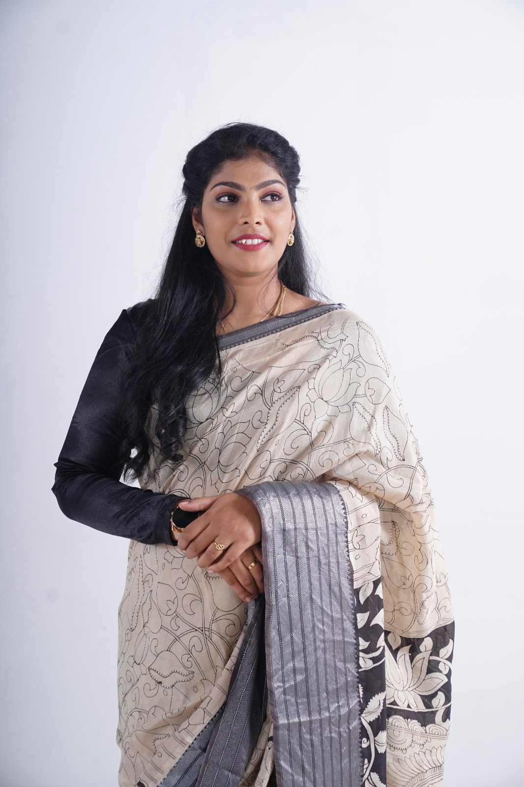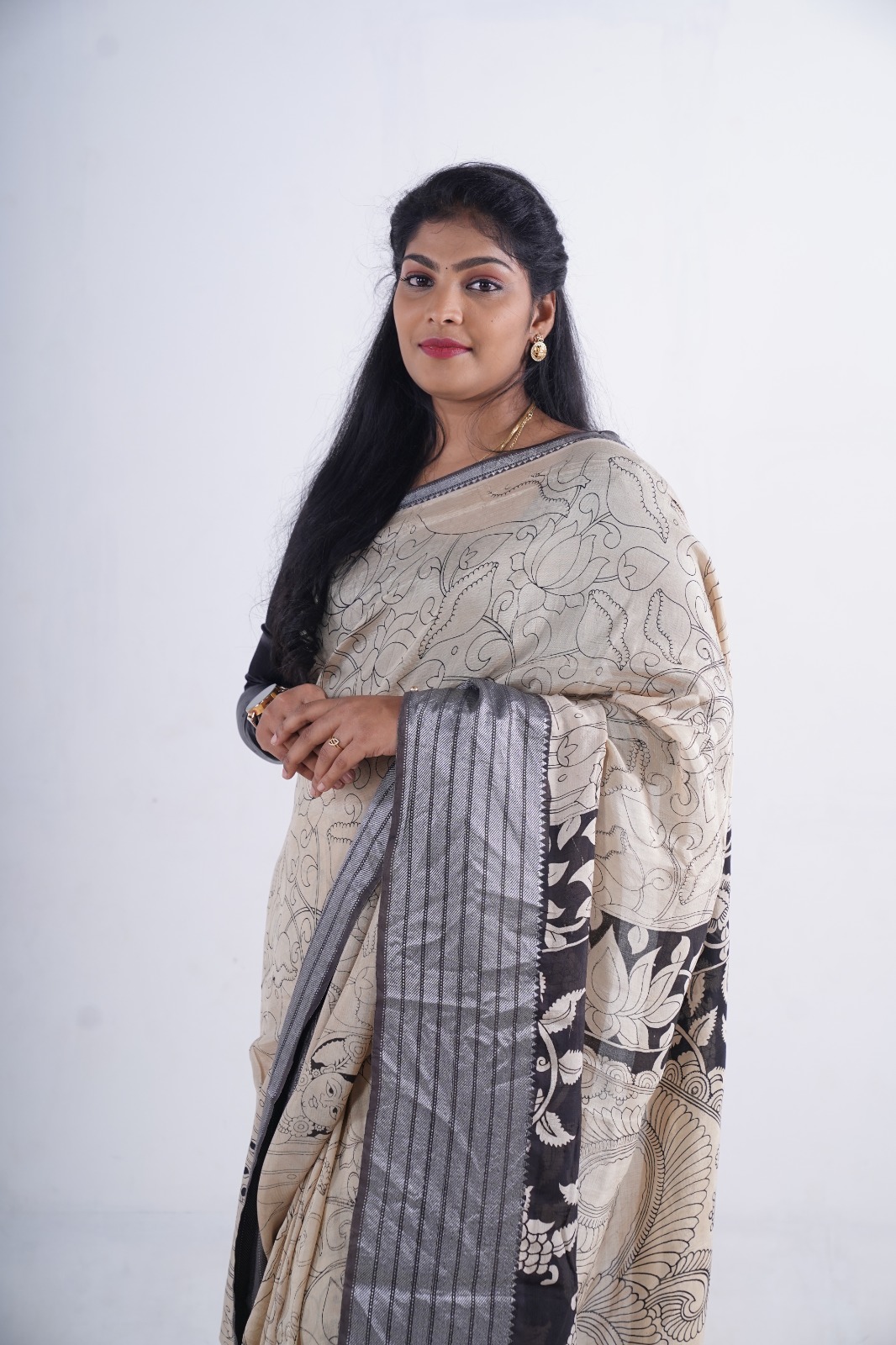 The contrasting black pallu and border are beautifully adorned with detailed Kalamkari floral and peacock patterns, creating a rich visual appeal. The subtle cream base enhances the intricate artwork, while the silver zari border adds a refined shimmer, making it ideal for both festive occasions and elegant gatherings.