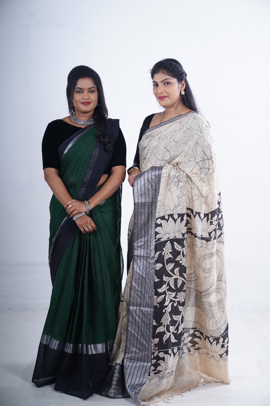 Grace and tradition come alive in this stunning cream and black Pen Kalamkari saree, designed with intricate hand-drawn motifs that tell stories of timeless artistry. Crafted from premium cotton, this saree combines elegance, comfort, and heritage in perfect harmony.