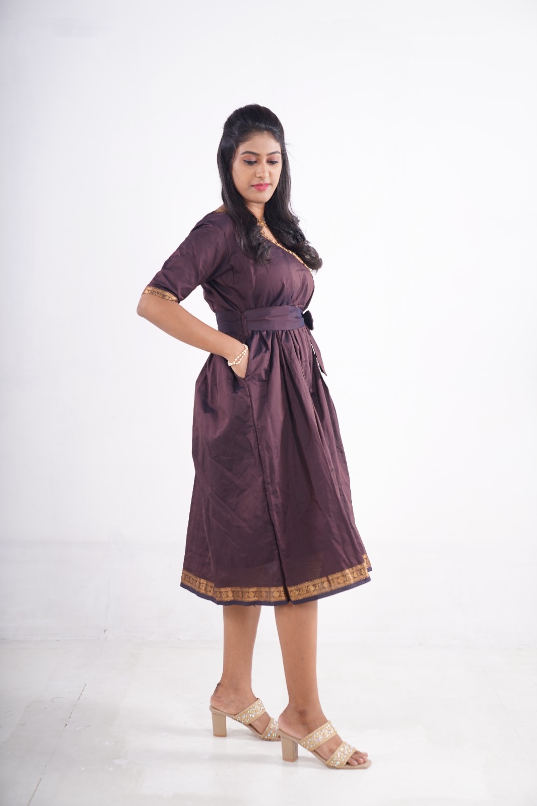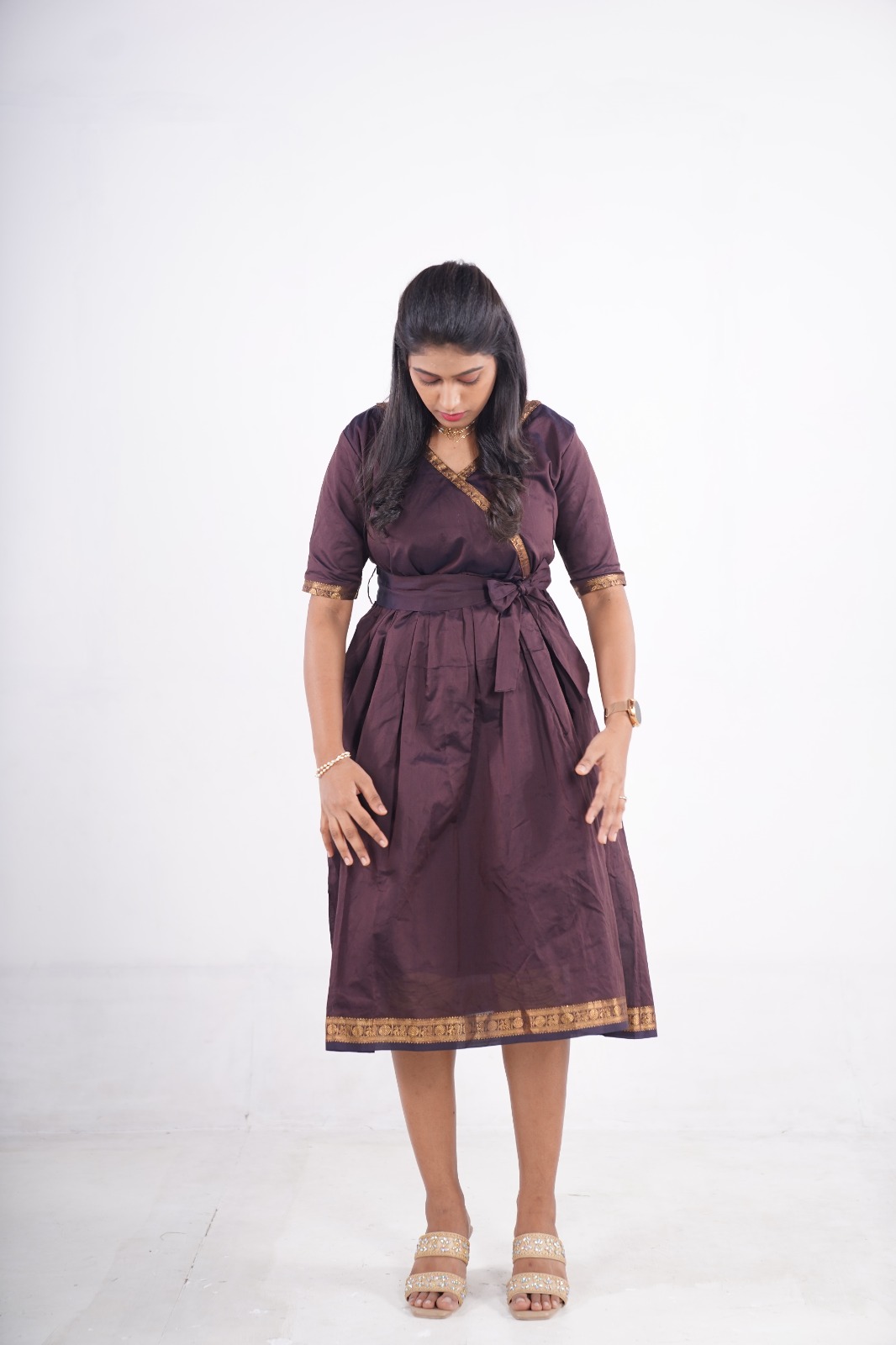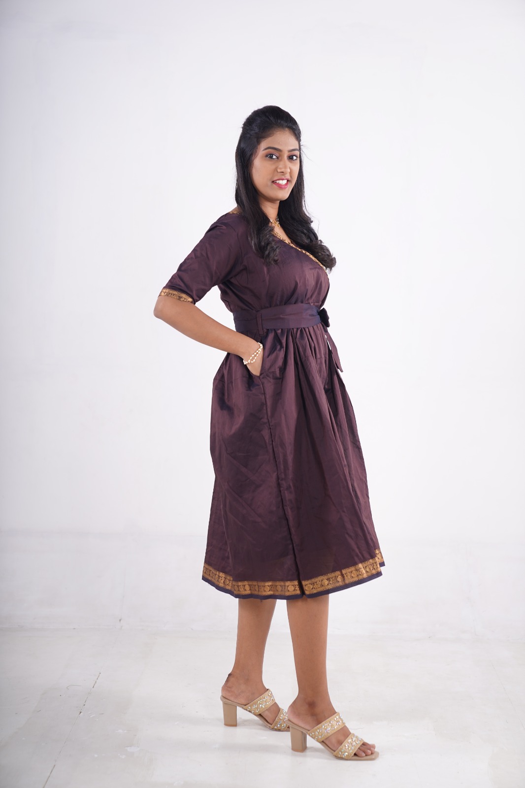 The fit-and-flare silhouette with a wrap-style neckline enhances your shape beautifully, while the two convenient side pockets add a modern, functional touch. Finished with a golden zari border, this dress blends ethnic grace with a contemporary twist.