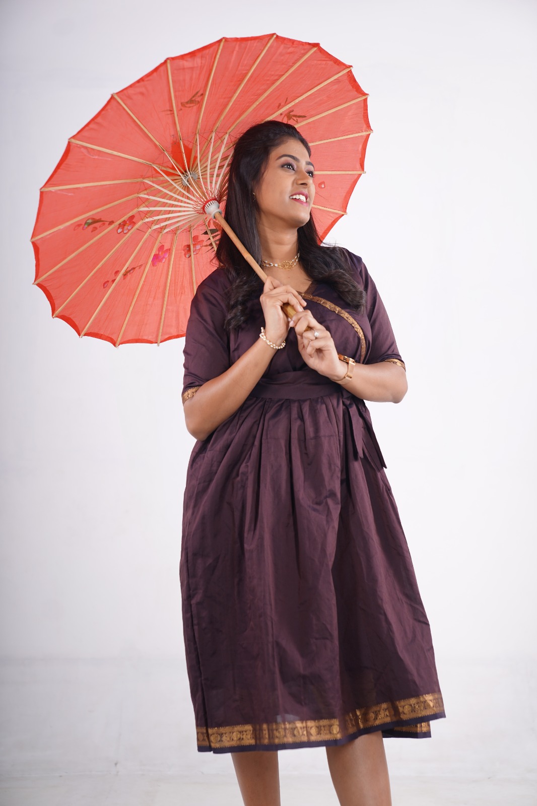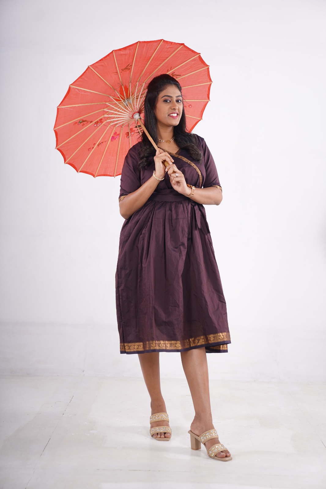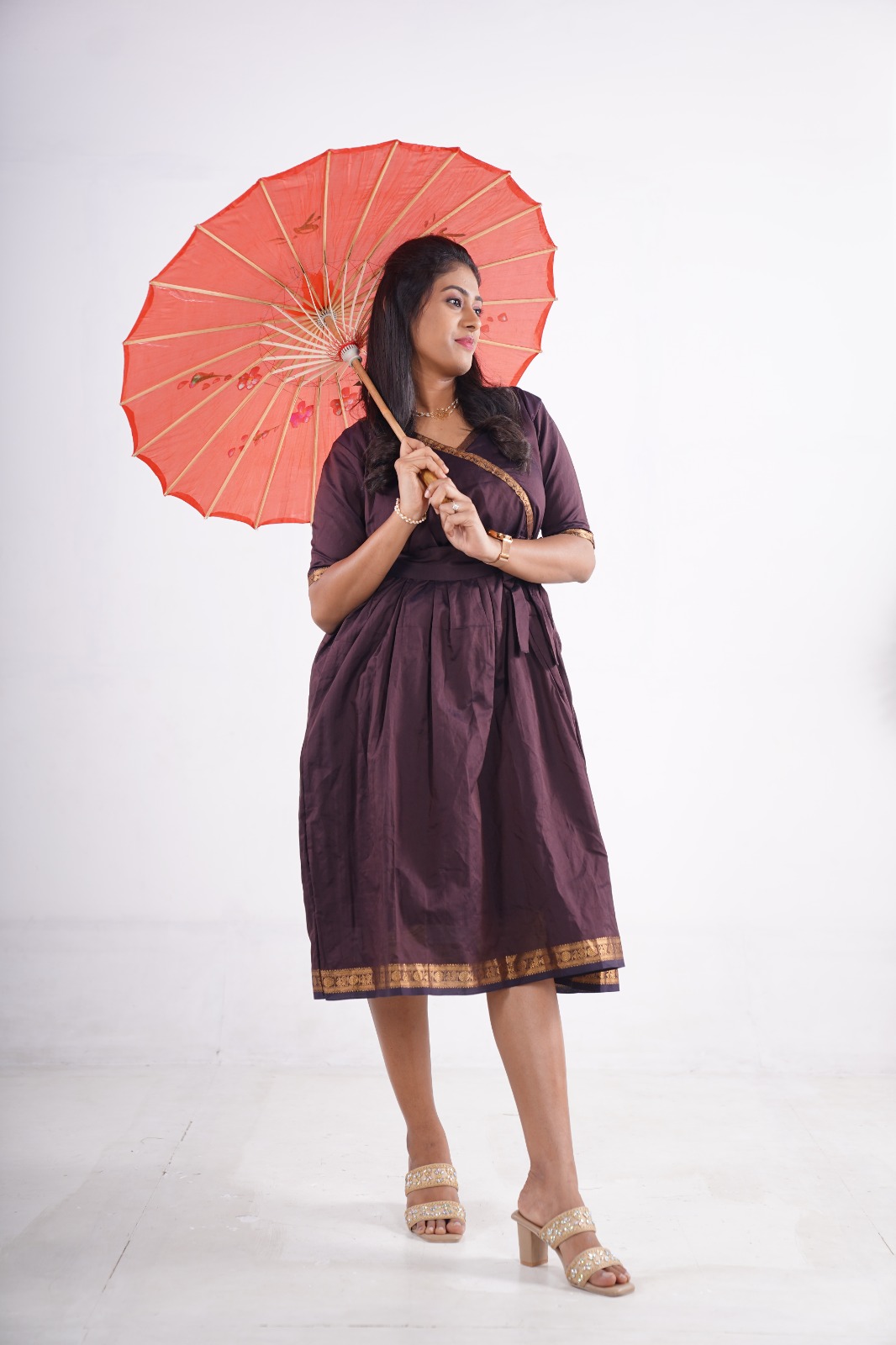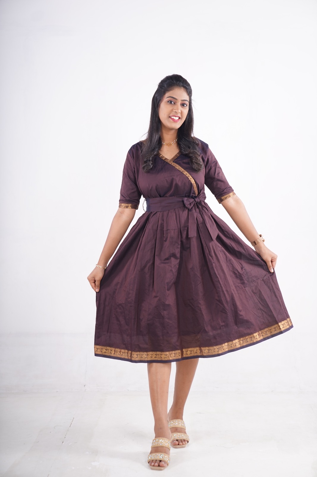The fit-and-flare silhouette with a wrap-style neckline enhances your shape beautifully, while the two convenient side pockets add a modern, functional touch. Finished with a golden zari border, this dress blends ethnic grace with a contemporary twist.